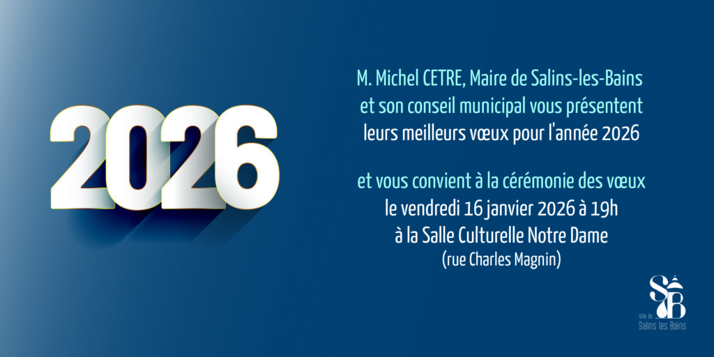 Monsieur le Maire et son Conseil municipal sont heureux d’inviter la population et les associations salinoises à la traditionnelle cérémonie de voeux qui se déroulera le vendredi 16 janvier à 19h salle Notre Dame, rue Charles Magnin.